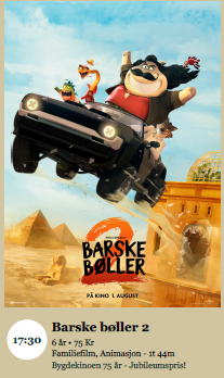 Da er vi endelig tilbake etter sommerferien og kan ønske velkommen til kino i Engerdalshallen tirsdag 2. september. Vi viser som vanlig